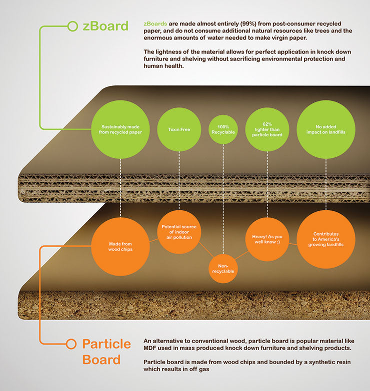 zBoards are made almost entirely (99%) from post-consumer recycled paper, and do not consume additional natural resources like trees and the enormous amounts of water needed to make virgin paper. Our patented, environmentally sound manufacturing process turns this post-consumer recycled paper into superbly strong boards that weigh 62% less than particle board with unmatched quality and durability. zBoards are the wave of the future.