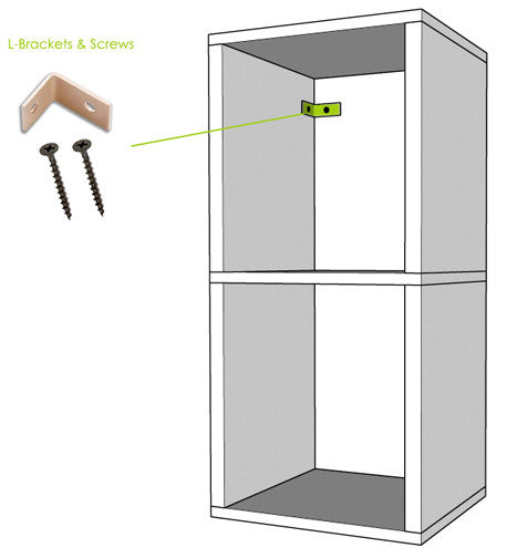 We recommend you anchor and secure as shown below, with L-brackets and screws into wall studs. This hardware is not included, but is readily available at your local hardware store.